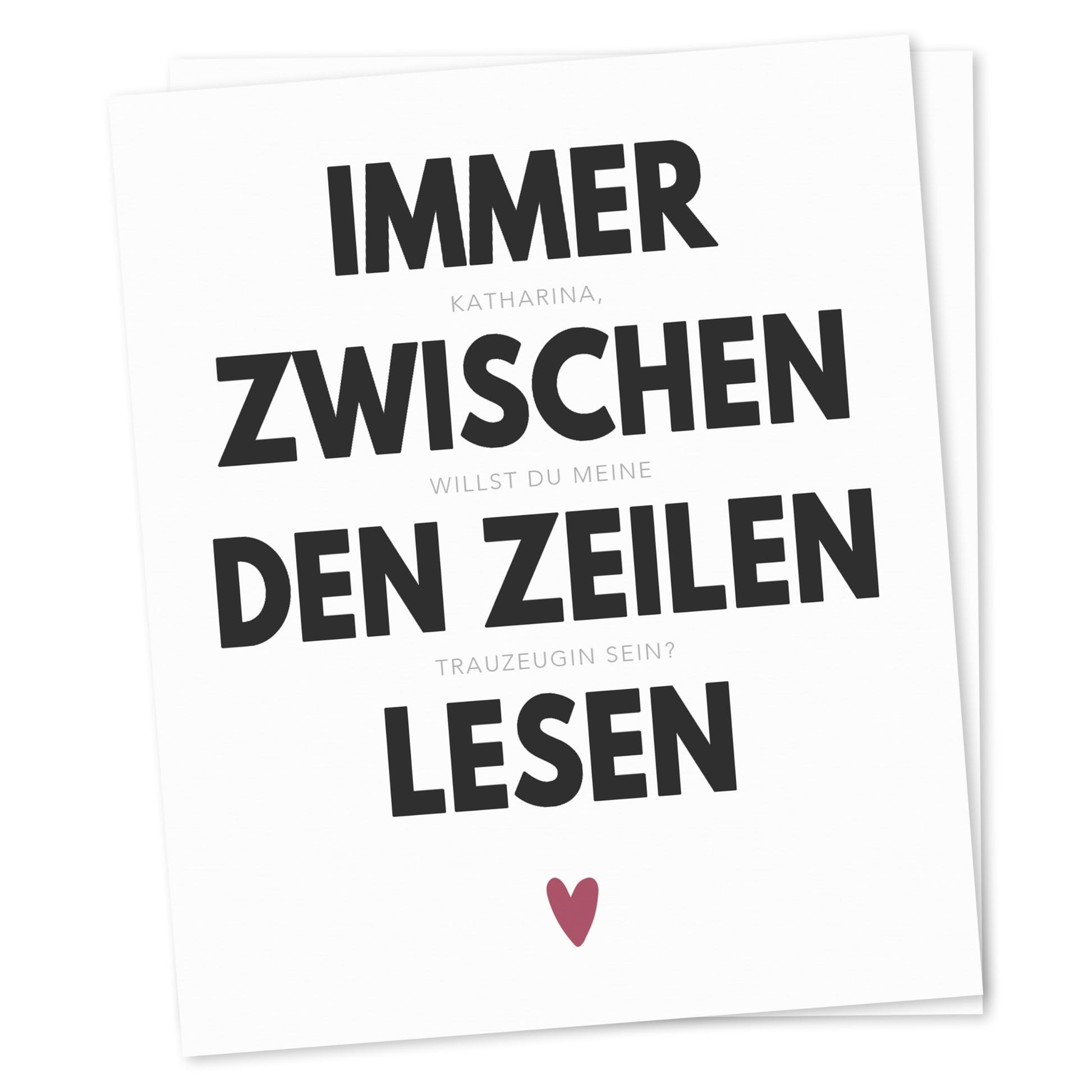 Verleihe deiner Hochzeit einen ganz besonderen Touch mit unseren personalisierten Flaschenetiketten „Immer zwischen den Zeilen lesen". Diese einzigartigen Etiketten sind die perfekte Möglichkeit, deiner besten Freundin oder einem geliebten Menschen auf kreative Weise zu fragen, ob sie die Ehre hat, deine Trauzeugin zu werden. Sie bieten eine elegante und unvergessliche Art, diesen wichtigen Moment zu zelebrieren und die Frage stilvoll zu übermitteln. Unsere Flaschenetiketten können mit deinem Wunschnamen personalisiert werden, um dem besonderen Anlass gerecht zu werden. Mit dem personalisierten Flaschenetikett zeigst du nicht nur deine Liebe und Wertschätzung, sondern machst auch den Moment der Anfrage noch bedeutungsvoller. Jedes Etikett wird auf hochwertigem, selbstklebenden, mattem Papier gedruckt, das eine langlebige Haftung garantiert und sicherstellt, dass die Flasche in bestem Zustand bleibt. Perfekt, um es auf eine herkömmliche 0,75 L Weinflasche zu kleben. So wird dein Vorschlag zum besonderen Highlight der Feier. Unsere personalisierten Flaschenetiketten sind nicht nur ein tolles Geschenk, sondern auch eine kreative Idee, um „Willst du meine Trauzeugin sein?" auf besondere Weise zu fragen. Bestelle noch heute dein personalisiertes Flaschenetikett und mache den ersten Schritt in eine unvergessliche Hochzeit mit einem einzigartigen und bedeutungsvollen Geschenk!