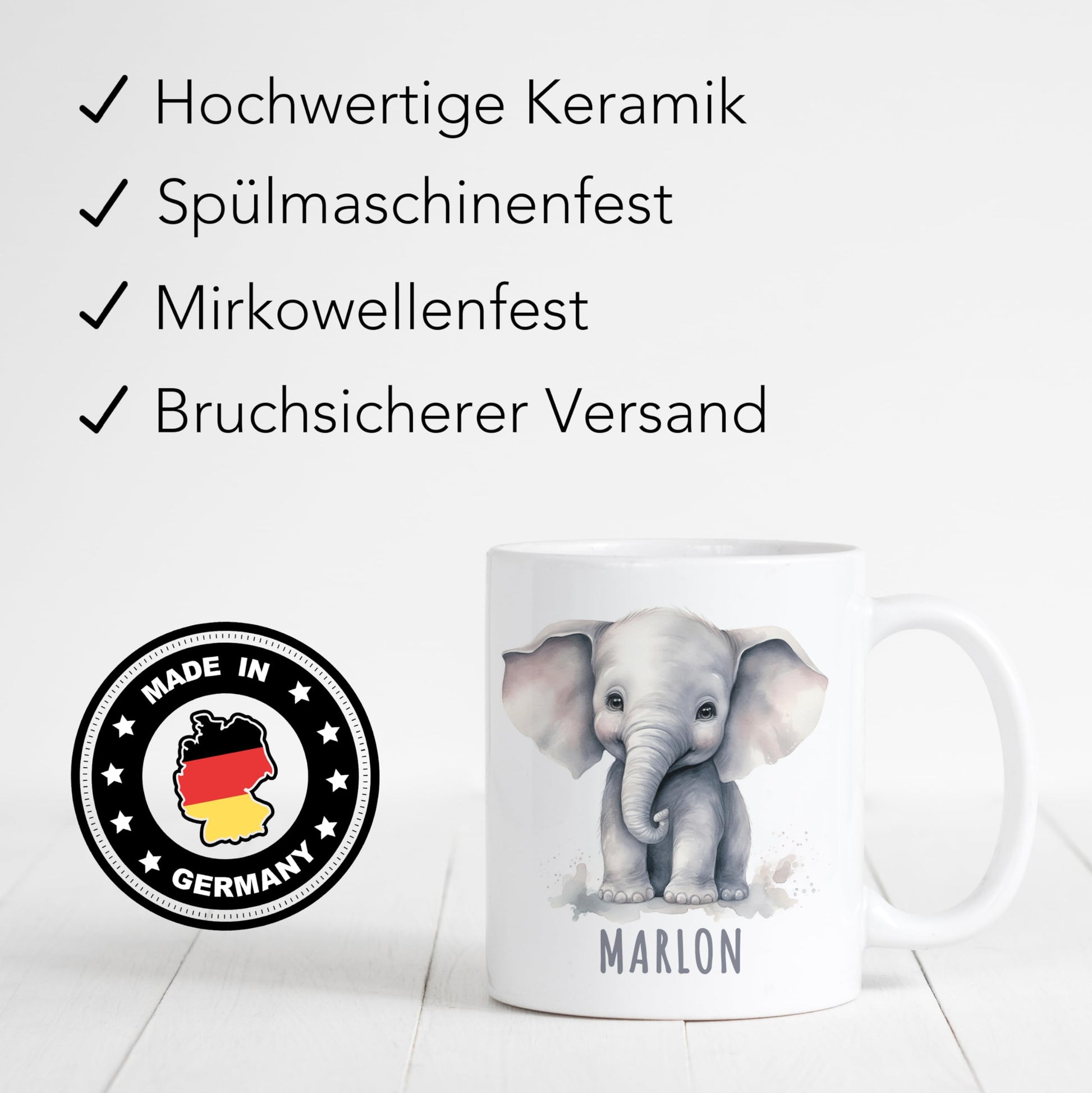 Die personalisierte Elefanten Tasse - Spaß und Freude für Groß und Klein. Elefanten sind nicht nur die Lieblingstiere vieler Kinder, sondern sie strahlen auch Fröhlichkeit und Unbeschwertheit aus. Unsere personalisierte Elefanten Kaffeetasse ist daher das ideale Geschenk, um Jungen und Mädchen gleichermaßen zu begeistern. Diese niedliche Kindertasse zeigt einen fröhlichen Elefanten, der garantiert ein Lächeln auf jedes Gesicht zaubert. Der besondere Clou: Du kannst die Tasse mit dem Namen des Besitzers oder der Besitzerin personalisieren. Das macht die Tasse zu einem einzigartigen und persönlichen Geschenk, das im Alltag für gute Laune sorgt. Ob als Geschenk zum Kindergeburtstag, zum Schulanfang oder einfach nur als Überraschung für zwischendurch, die personalisierte Keramiktasse ist vielseitig einsetzbar. Kinder werden die lustige Illustration lieben und stolz darauf sein, ihre eigene Tasse zu besitzen. Aber nicht nur Kinder werden von dieser Tasse begeistert sein. Auch Erwachsene, die eine Vorliebe für niedliche und humorvolle Designs haben, werden sich über dieses Geschenk freuen. Ob im Büro, Kindergarten oder zu Hause, diese Tasse wird zum Hingucker und Gesprächsthema. Unsere Tassen sind aus hochwertiger Keramik gefertigt und wurden so gestaltet, dass sie den Anforderungen des täglichen Gebrauchs standhalten. Sie sind robust, langlebig und leicht zu reinigen. Egal ob für den morgendlichen Kaffee, Tee oder für Kakao am Abend, die Tasse ist vielseitig einsetzbar. Die personalisierte Elefanten Namenstasse ist nicht nur ein Geschenk, sondern auch ein täglicher Begleiter, der Freude und gute Laune in den Alltag bringt. Sie erinnert daran, dass es wichtig ist, auch im stressigen Alltag das Lächeln nicht zu vergessen. Überrasche deine Lieben, sei es Kinder oder Erwachsene, mit dieser entzückenden Tasse und schenke ihnen Freude, Spaß und ein ganz persönliches Geschenk. Bestelle jetzt und zaubere ein Lächeln in den Alltag!