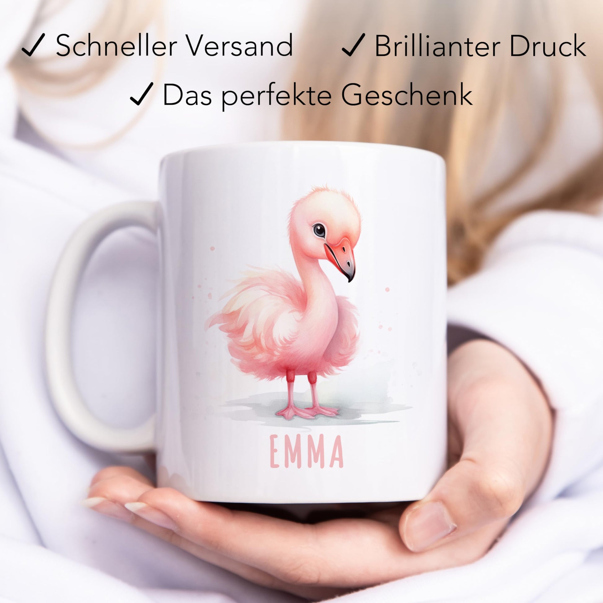 Die personalisierte Flamingo Tasse - Spaß und Freude für Groß und Klein. Flamingos sind nicht nur die Lieblingstiere vieler Kinder, sondern sie strahlen auch Fröhlichkeit und Unbeschwertheit aus. Unsere personalisierte Flamingo Kaffeetasse ist daher das ideale Geschenk, um Jungen und Mädchen gleichermaßen zu begeistern. Diese niedliche Kindertasse zeigt einen fröhlichen Flamingo, der garantiert ein Lächeln auf jedes Gesicht zaubert. Der besondere Clou: Du kannst die Tasse mit dem Namen des Besitzers oder der Besitzerin personalisieren. Das macht die Tasse zu einem einzigartigen und persönlichen Geschenk, das im Alltag für gute Laune sorgt. Ob als Geschenk zum Kindergeburtstag, zum Schulanfang oder einfach nur als Überraschung für zwischendurch, die personalisierte Keramiktasse ist vielseitig einsetzbar. Kinder werden die lustige Illustration lieben und stolz darauf sein, ihre eigene Tasse zu besitzen. Aber nicht nur Kinder werden von dieser Tasse begeistert sein. Auch Erwachsene, die eine Vorliebe für niedliche und humorvolle Designs haben, werden sich über dieses Geschenk freuen. Ob im Büro, Kindergarten oder zu Hause, diese Tasse wird zum Hingucker und Gesprächsthema. Unsere Tassen sind aus hochwertiger Keramik gefertigt und wurden so gestaltet, dass sie den Anforderungen des täglichen Gebrauchs standhalten. Sie sind robust, langlebig und leicht zu reinigen. Egal ob für den morgendlichen Kaffee, Tee oder für Kakao am Abend, die Tasse ist vielseitig einsetzbar. Die personalisierte Flamingo Namenstasse ist nicht nur ein Geschenk, sondern auch ein täglicher Begleiter, der Freude und gute Laune in den Alltag bringt. Sie erinnert daran, dass es wichtig ist, auch im stressigen Alltag das Lächeln nicht zu vergessen. Überrasche deine Lieben, sei es Kinder oder Erwachsene, mit dieser entzückenden Tasse und schenke ihnen Freude, Spaß und ein ganz persönliches Geschenk. Bestelle jetzt und zaubere ein Lächeln in den Alltag!