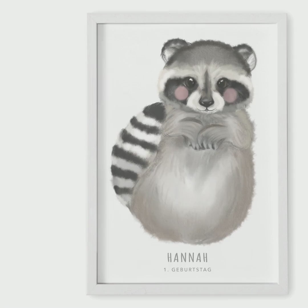 Dieses wunderschöne, personalisierte Fußabdruck Poster mit einem süßen Waschbären, ist ein tolles Baby Geschenk zur Geburt oder zum Geburtstag deines Kindes. Das perfekte Babygeschenk zur Geburt. Einfach die Fußabdrücke deines Babys oder Kindes auftragen und fertig!