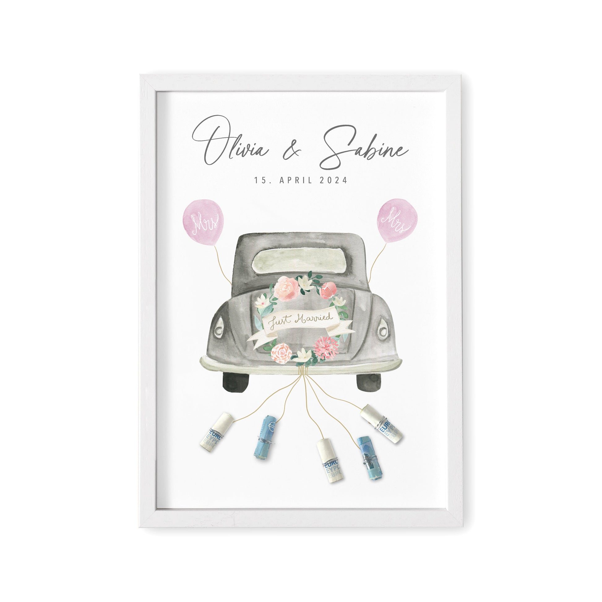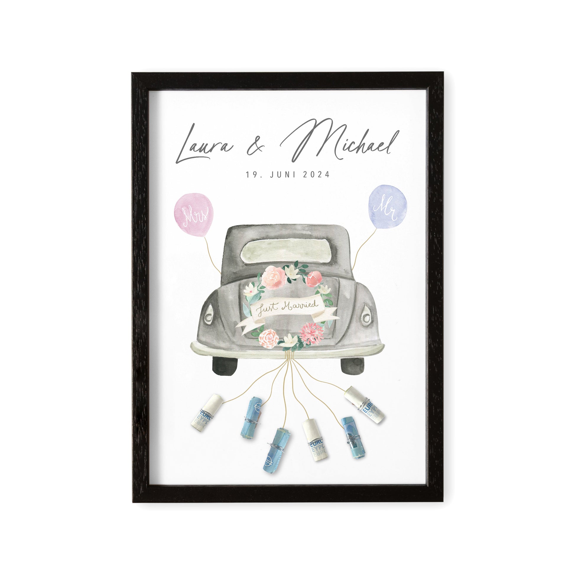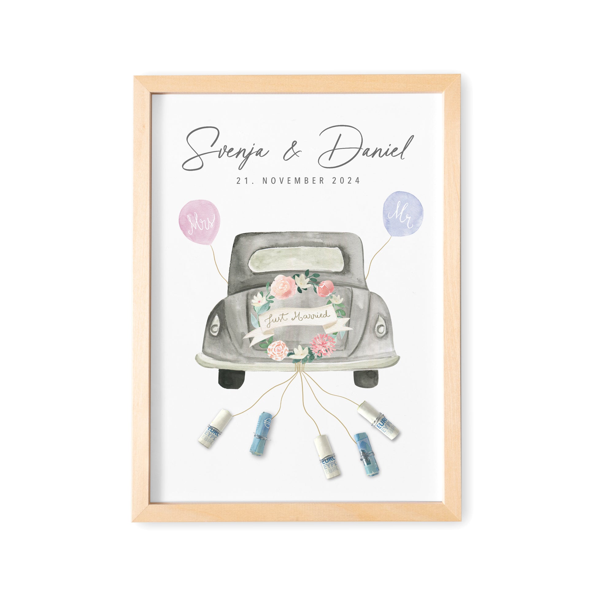 Dieses wunderschöne, personalisierte Hochzeitsbild mit einem Auto und dem Schriftzug“Just Married” ist das perfekte Geschenk zur Hochzeit für das Brautpaar, um Geldscheine stilvoll zu verpacken. Es ist eine tolle Geschenkidee zur Hochzeitsfeier, die zeigt, wie viel dir die Braut und der Bräutigam am Herzen liegen und wie viel sie dir bedeuten. Dieses Hochzeitsposter erinnert das Paar an den wichtigsten Moment in ihrem Leben. Das personalisierbare Bild kann mit dem Datum der standesamtlichen oder kirchlichen Hochzeit sowie dem Namen der Braut und des Bräutigams individualisiert werden. Das Hochzeitsbild kann in verschiedenen Größen und auf Wunsch mit Premium Echtholzrahmen von Hand gerahmt bestellt werden. Die Rahmen sind in den Farben natur, schwarz und weiß verfügbar. Dieses Geldgeschenk zur Hochzeitsfeier ist eine ganz besondere Art, dem Brautpaar zu gratulieren und ihnen zu zeigen, wie sehr sie geliebt werden. Ein Geschenk, das das Brautpaar immer in Erinnerung behalten wird und als Wohnzimmer oder Esszimmer Deko einen ganz besonderen Platz in der Wohnung bekommen wird.