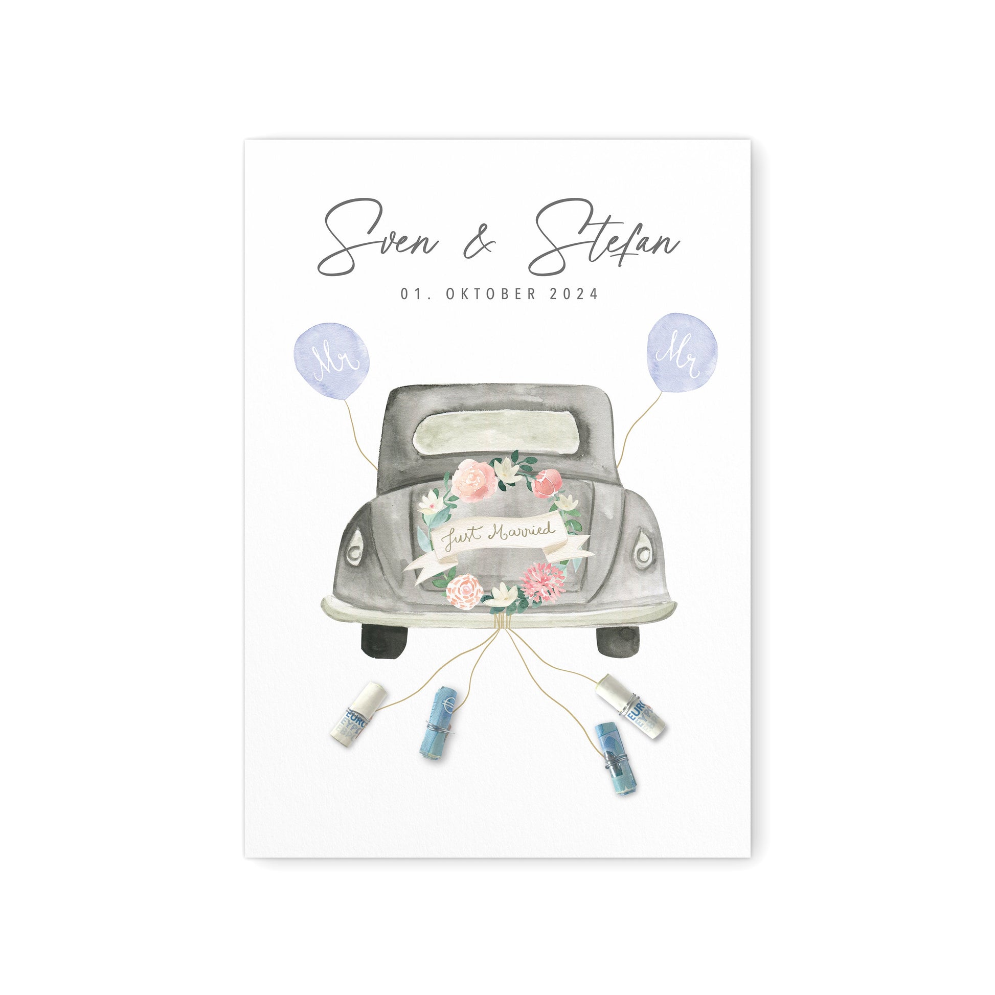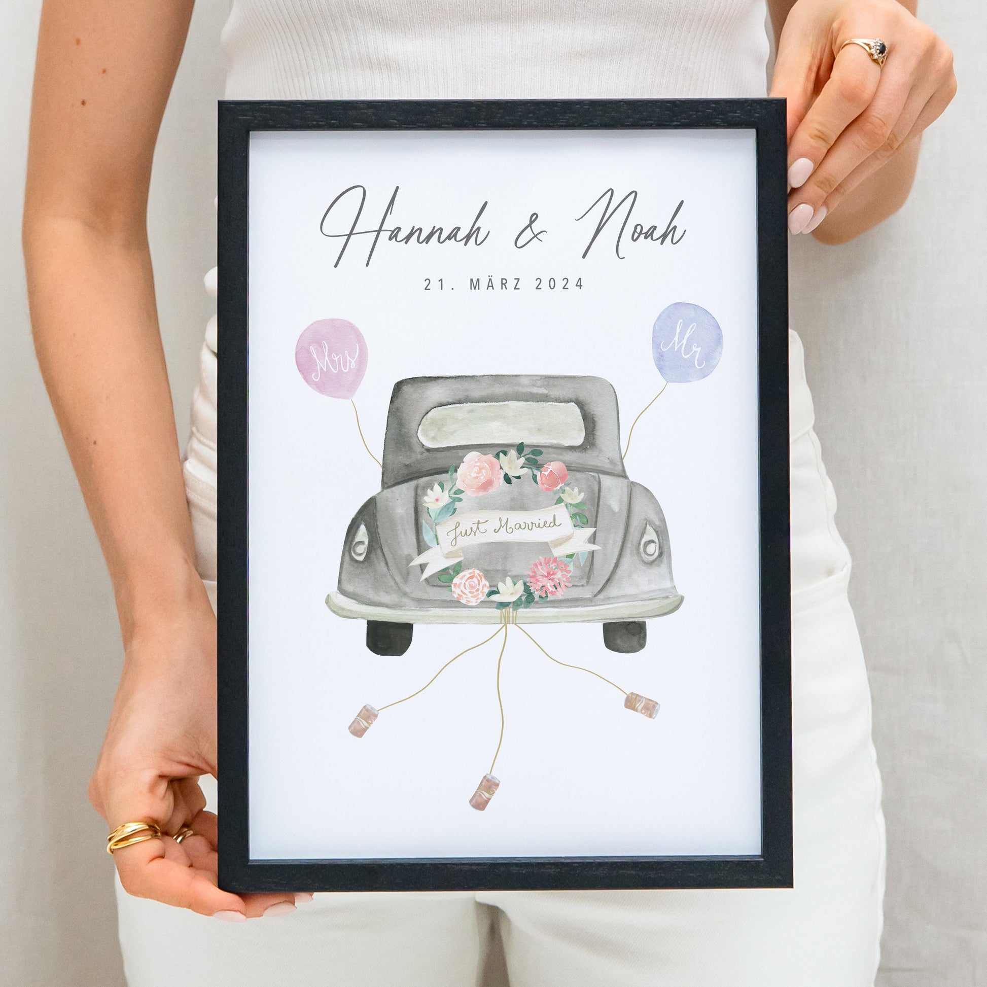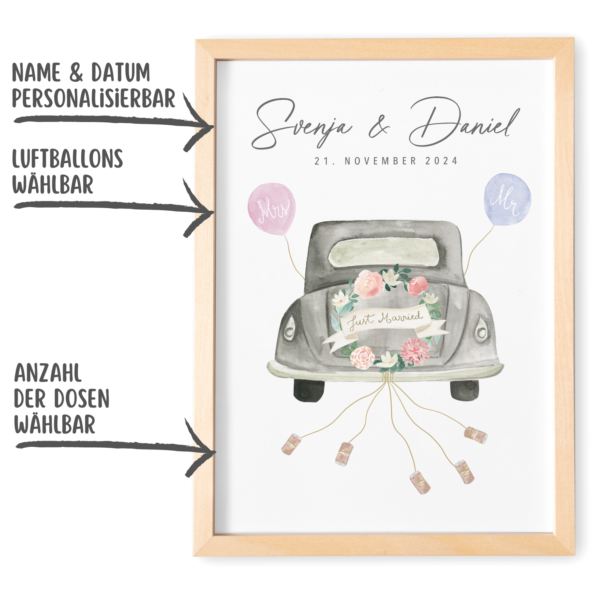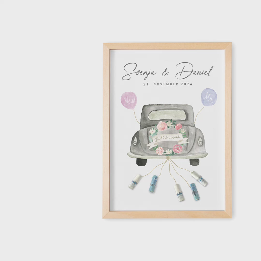 Dieses wunderschöne, personalisierte Hochzeitsbild mit einem Auto und dem Schriftzug“Just Married” ist das perfekte Geschenk zur Hochzeit für das Brautpaar, um Geldscheine stilvoll zu verpacken. Es ist eine tolle Geschenkidee zur Hochzeitsfeier, die zeigt, wie viel dir die Braut und der Bräutigam am Herzen liegen und wie viel sie dir bedeuten. Dieses Hochzeitsposter erinnert das Paar an den wichtigsten Moment in ihrem Leben. Das personalisierbare Bild kann mit dem Datum der standesamtlichen oder kirchlichen Hochzeit sowie dem Namen der Braut und des Bräutigams individualisiert werden. Das Hochzeitsbild kann in verschiedenen Größen und auf Wunsch mit Premium Echtholzrahmen von Hand gerahmt bestellt werden. Die Rahmen sind in den Farben natur, schwarz und weiß verfügbar. Dieses Geldgeschenk zur Hochzeitsfeier ist eine ganz besondere Art, dem Brautpaar zu gratulieren und ihnen zu zeigen, wie sehr sie geliebt werden. Ein Geschenk, das das Brautpaar immer in Erinnerung behalten wird und als Wohnzimmer oder Esszimmer Deko einen ganz besonderen Platz in der Wohnung bekommen wird.