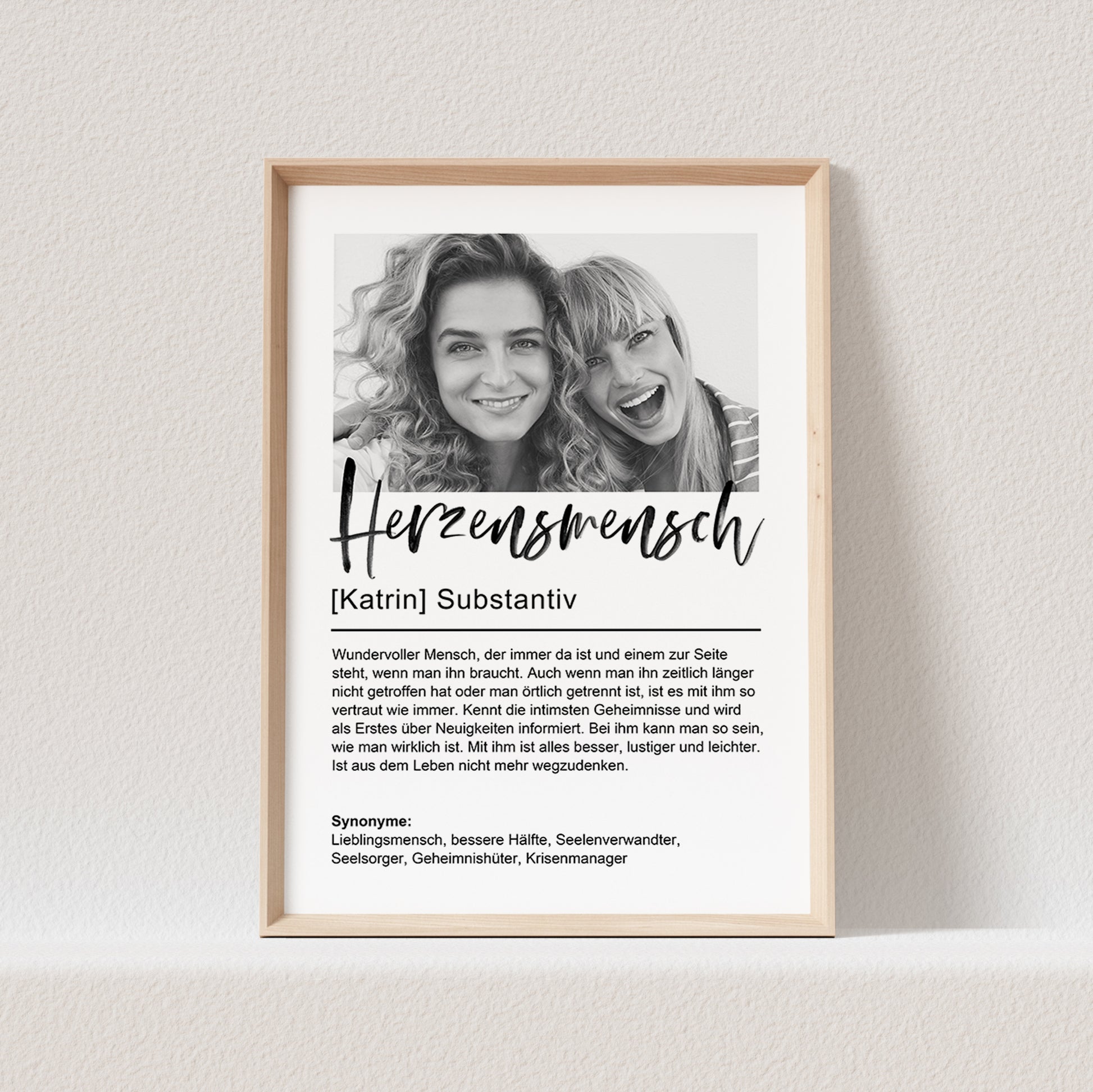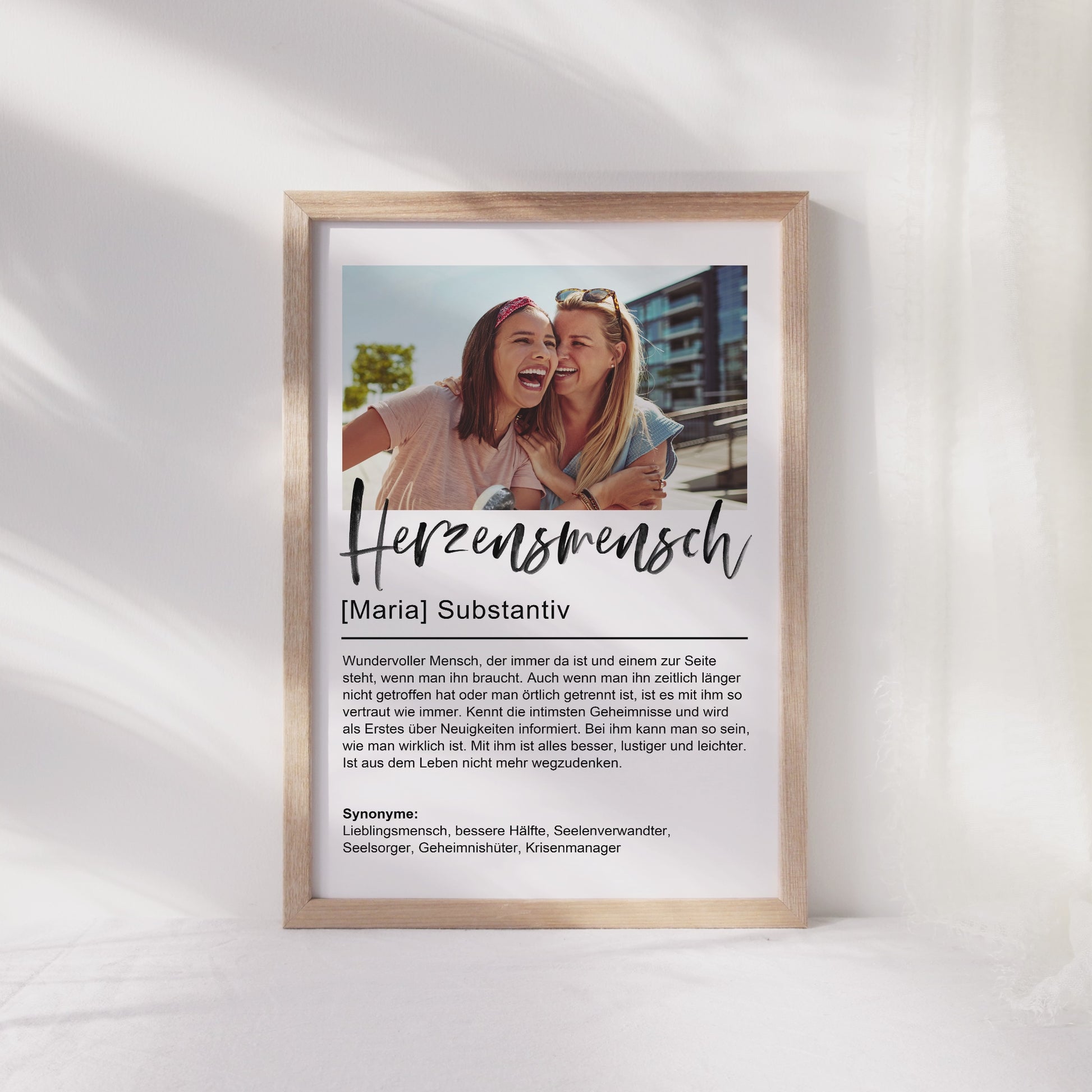 Dieses wunderschöne, personalisierbare Fotoposter in Farbe mit der Definition Herzensmensch und Namen ist das perfekte Geschenk zum Geburtstag oder um einfach mal so Danke zu sagen. Zeig deiner Mama, deiner Freundin oder Ehefrau, wie gern du sie hast.