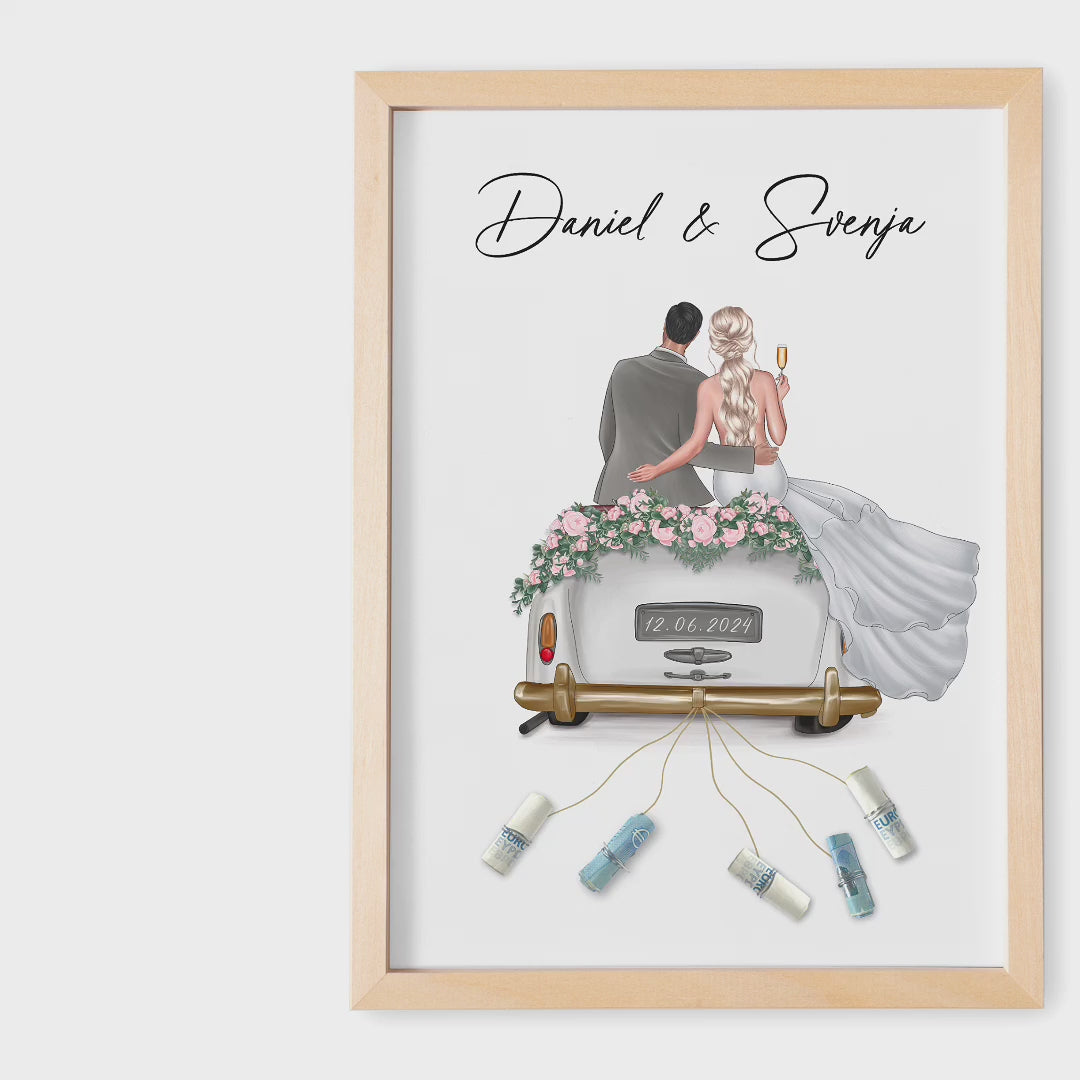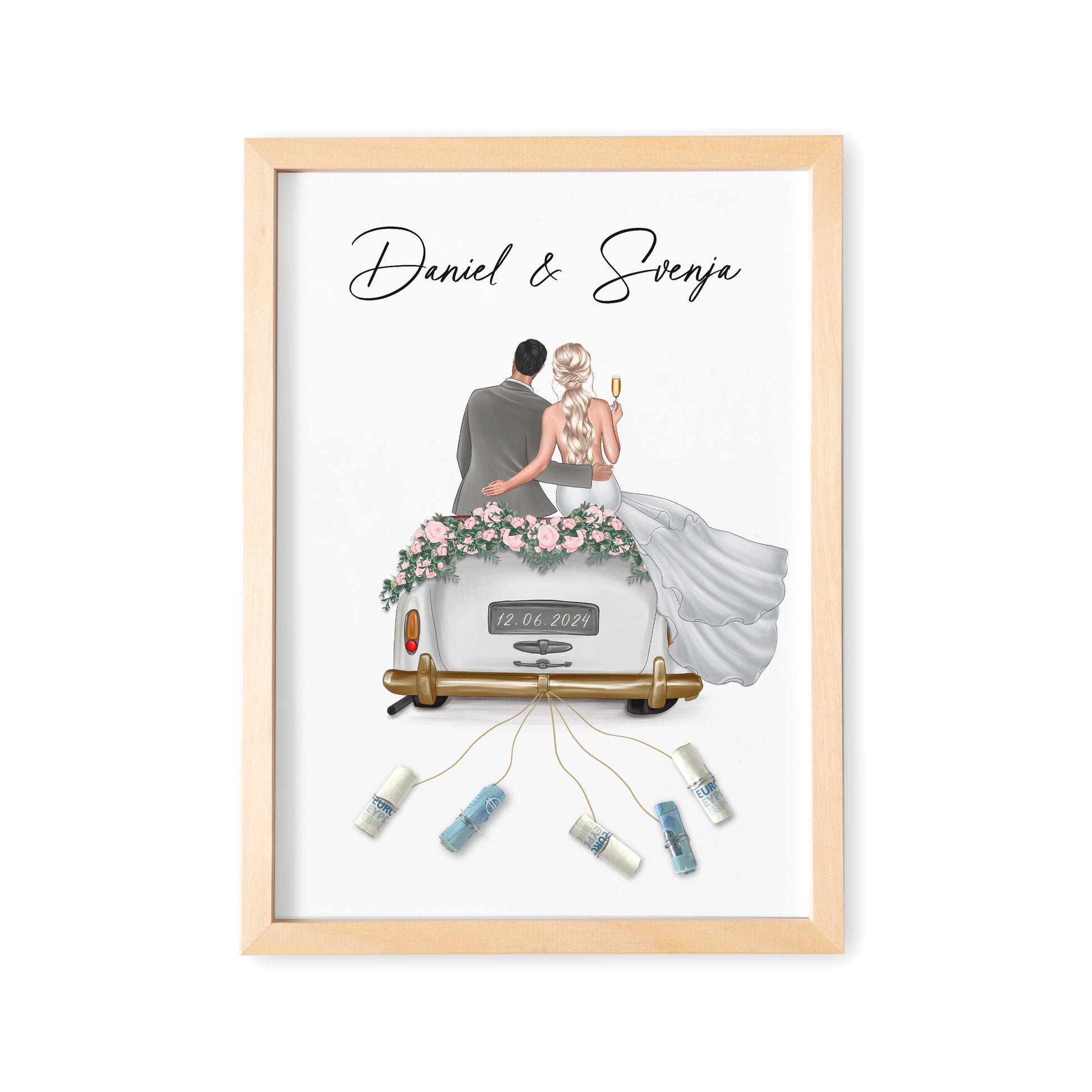 Dieses wunderschöne, personalisierte Hochzeitsbild mit einem Auto mit Blumenschmuck und dem Brautpaar ist das perfekte Geschenk zur Hochzeit für Braut und Bräutigam, um Geldscheine stilvoll und persönlich zu verpacken. Es ist eine tolle Geschenkidee zur Hochzeitsfeier, die zeigt, wie viel dir die Braut und der Bräutigam am Herzen liegen und wie viel sie dir bedeuten. Dieses Hochzeitsposter erinnert das Paar an den wichtigsten Moment in ihrem Leben. Das personalisierbare Bild kann mit den Namen der Braut und des Bräutigams individualisiert werden. Darüber hinaus können die Hautfarben, Frisuren, der Anzug und das Hochzeitskleid des Paares gestaltet werden. Das Hochzeitsbild kann in verschiedenen Größen und auf Wunsch mit Premium Echtholzrahmen von Hand gerahmt bestellt werden. Die Rahmen sind in den Farben natur, schwarz und weiß verfügbar. Dieses Geldgeschenk zur Hochzeitsfeier ist eine ganz besondere Art, dem Brautpaar zu gratulieren und ihnen zu zeigen, wie sehr sie geliebt werden. Ein Geschenk, das das Brautpaar immer in Erinnerung behalten wird und als Wohnzimmer oder Esszimmer Deko einen ganz besonderen Platz in der Wohnung bekommen wird.