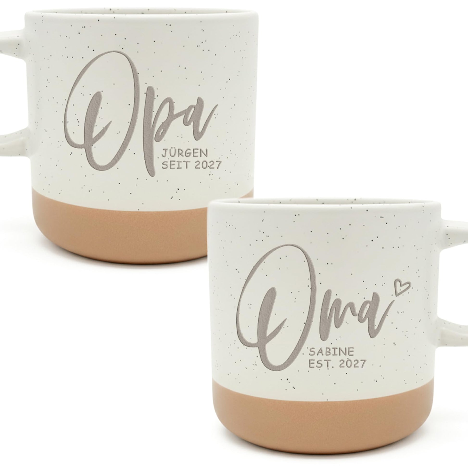 Ihr seid auf der Suche nach einem herzlichen und persönlichen Geschenk, um euren Eltern die freudige Nachricht von eurer Schwangerschaft zu verkünden? Dann haben wir genau das Richtige für euch: das personalisierte Oma Opa Tassenpaar aus Steingut Keramik. Mit diesen Tassen könnt ihr eure werdenden Großeltern auf eine süße und originelle Weise überraschen. Das Oma Opa Tassenpaar ist eine wunderbare Möglichkeit, die Freude über die Schwangerschaft mit euren Eltern zu teilen. Die Tassen sind mit der Gravur "Oma" und "Opa" versehen und können mit den Namen des werdenden Großelternpaares personalisiert werden. Jeder Schluck aus diesen Tassen wird sie daran erinnern, dass sie bald Großeltern werden und ein neues Familienmitglied willkommen heißen dürfen. Die Tassen bestehen aus hochwertigem Keramikmaterial und haben ein Fassungsvermögen von ca. 360 ml. Sie sind spülmaschinenfest und damit leicht zu reinigen. Besonders persönlich wird das Tassenpaar durch die Möglichkeit, den Namen der Großmutter bzw. des Großvaters und das Geburtsjahr des Enkelkindes zu personalisieren. Das moderne Design und die liebevollen Details machen sie zu einem stilvollen Geschenk für werdende Großeltern. Mit dem Oma Opa Tassenpaar könnt ihr eure Schwangerschaft auf eine besondere und originelle Weise verkünden. Überreicht die Tassen euren Eltern und lasst sie die Nachricht langsam erkennen. Der Moment, in dem sie realisieren, dass sie Großeltern werden, wird unvergesslich sein und sicherlich viele Emotionen wecken. Dieses personalisierte Tassenpaar eignet sich auch ideal als Geschenk für eine Baby Shower oder als kleines Präsent, um die Vorfreude auf das kommende Baby zu teilen. Es ist eine liebevolle Geste, die zeigt, wie sehr ihr euch auf eure Elternrolle freut und dass ihr sie als Großeltern schätzt. Also, lasst eure Eltern an eurer Freude teilhaben und überrascht sie mit dem personalisierten Oma Opa Tassenpaar. Es wird nicht nur ihre Herzen erwärmen, sondern auch eine Erinnerung an diese besondere Zeit schaffen. Bestellt jetzt und verkündet die Schwangerschaft auf eine einzigartige und liebevolle Weise!