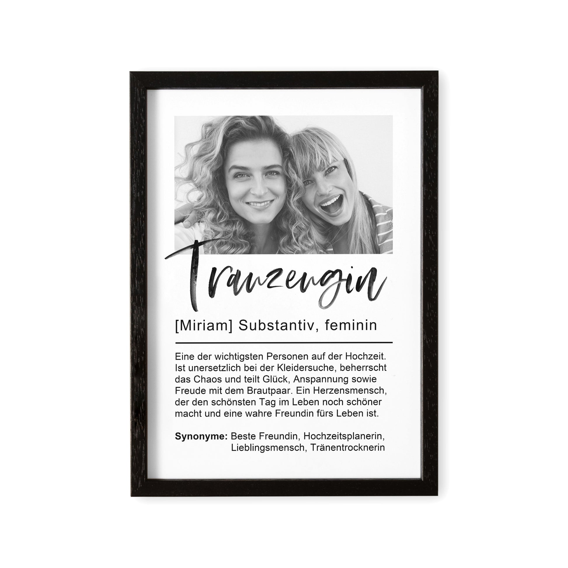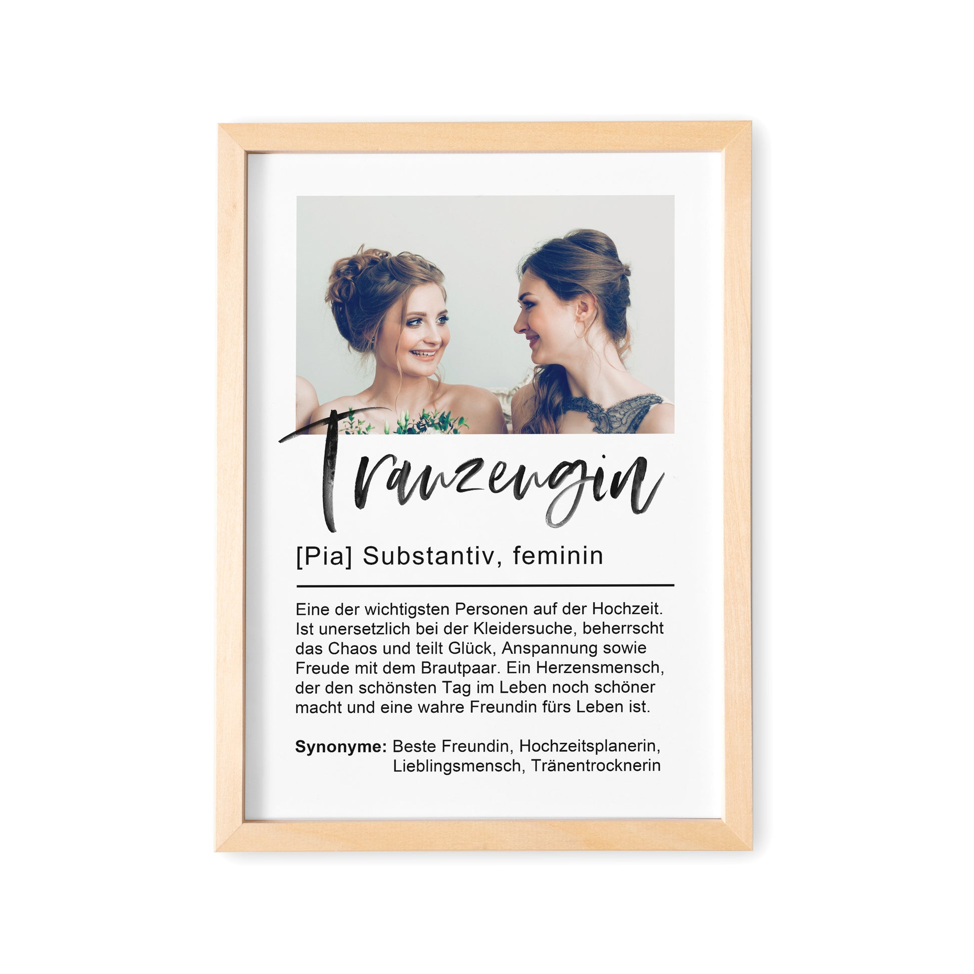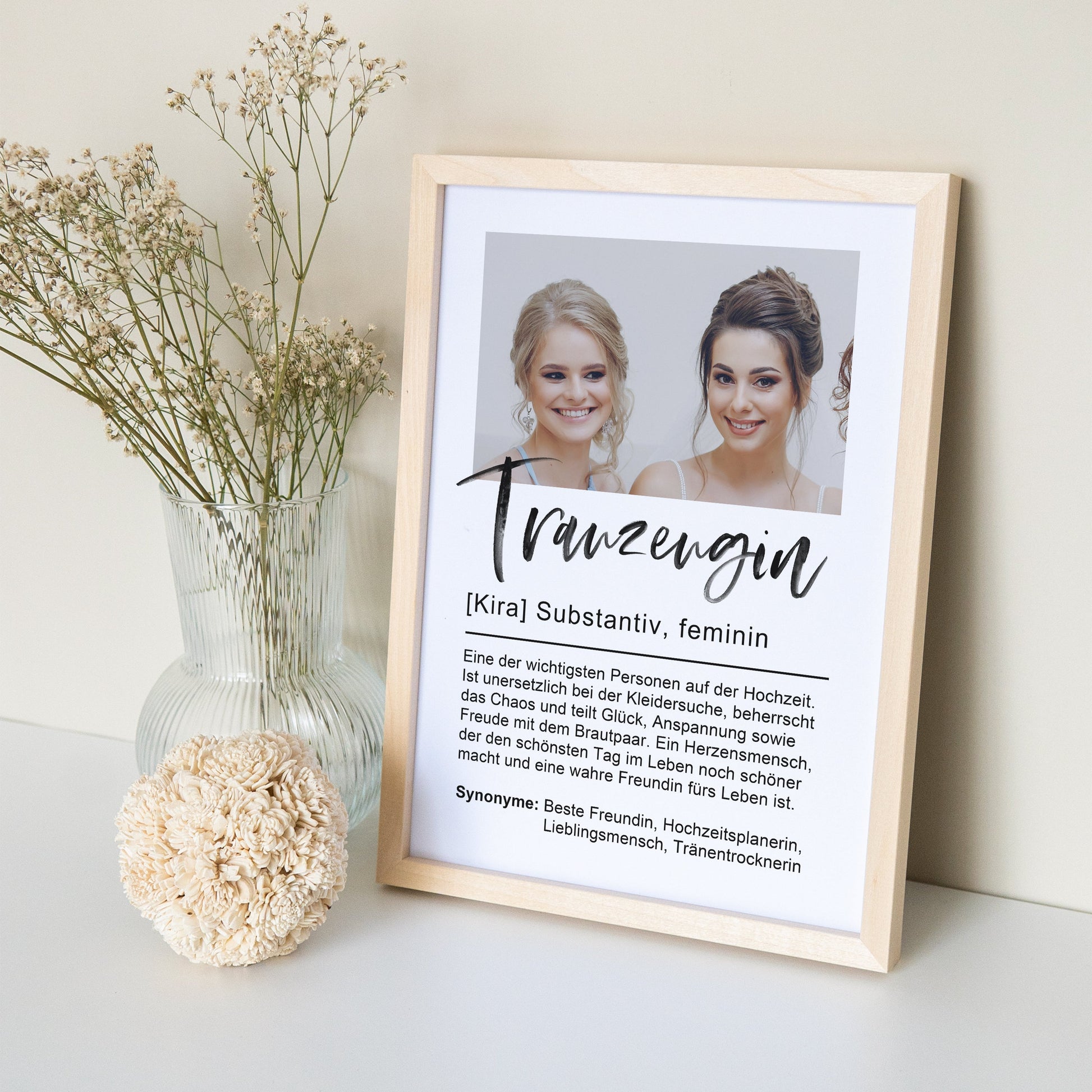 Das Trauzeugin Fotoposter mit eurem Foto personalisiert ist das perfekte Geschenk für jede Trauzeugin, die an der Seite der Braut an ihrem großen Tag gestanden hat. Dieses einzigartige Trauzeugin Definition Poster ist eine wunderschöne Erinnerung an die wertvolle Rolle, die die Trauzeugin bei der Hochzeit gespielt hat. Es ist eine einfühlsame Art und Weise, um "Danke" zu sagen und die unvergesslichen Momente der Hochzeit zu feiern. Das Trauzeugin Bild mit dem Wort “Danke” und einem Herzen ist ein persönliches Geschenk für die Trauzeugin, das sie für immer schätzen wird. Das Poster ist in einer stilvollen Art und Weise gestaltet, die perfekt für jede Inneneinrichtung geeignet ist. Es ist ein zeitloses Geschenk, das für viele Jahre an die Hochzeit erinnert. Das Geschenk für die Trauzeugin Hochzeit ist sehr wichtig und sollte mit viel Liebe und Sorgfalt ausgewählt werden. Das Trauzeugin Bild mit Foto ist eine großartige Wahl, da es die Liebe und Dankbarkeit der Braut zeigt. Es ist ein Geschenk, das von Herzen kommt und das für viele Jahre geschätzt wird. Das Trauzeugin Poster ist in verschiedenen Größen erhältlich und kann optional mit Premium Echtholzrahmen in den Farben natur, schwarz oder weiß bestellt werden, sodass es für jede Einrichtung geeignet ist. Das Poster ist aus hochwertigem Papier gefertigt und hat eine matte Oberfläche, die das Foto perfekt zur Geltung bringt. Zusammenfassend ist das Fotogeschenk eine wunderschöne Geschenkidee für jede Trauzeugin. Es ist ein Geschenk, das von Herzen kommt und das die Dankbarkeit und Liebe der Braut zeigt. Das Poster ist eine wunderbare Erinnerung an die Hochzeit und wird für viele Jahre geschätzt werden. Es ist ein Geschenk, das man der Trauzeugin mit Stolz und Freude überreichen kann.