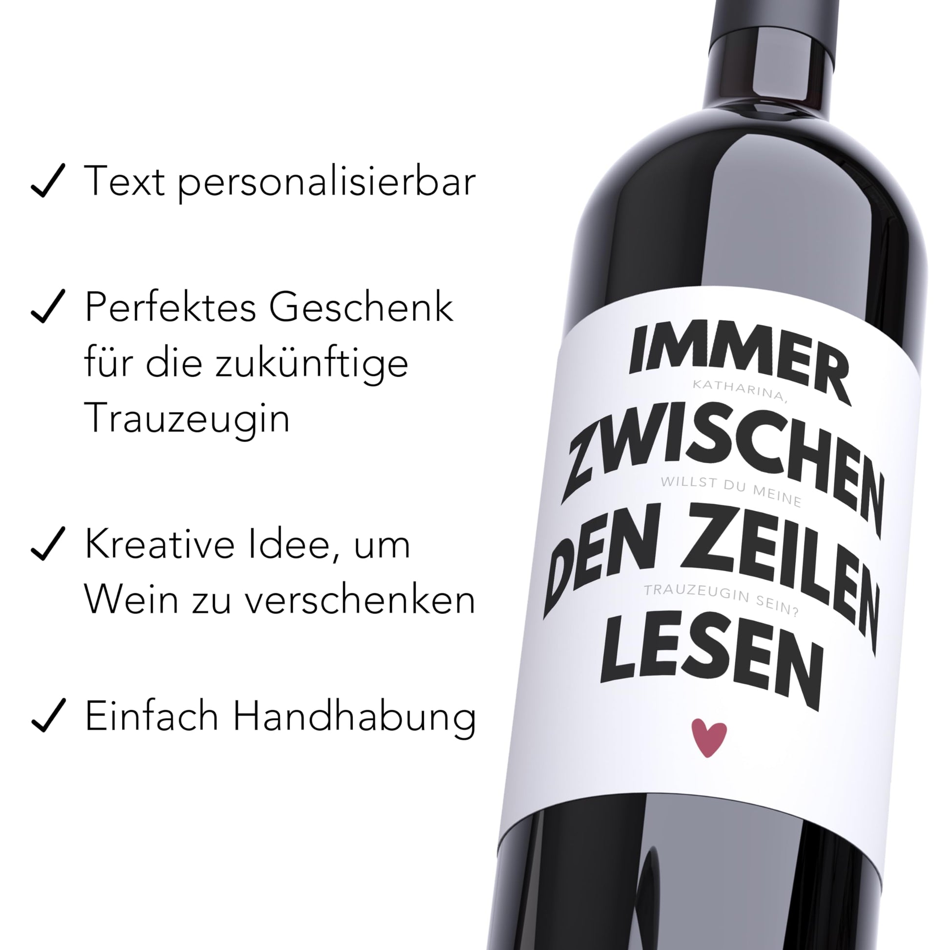Verleihe deiner Hochzeit einen ganz besonderen Touch mit unseren personalisierten Flaschenetiketten „Immer zwischen den Zeilen lesen". Diese einzigartigen Etiketten sind die perfekte Möglichkeit, deiner besten Freundin oder einem geliebten Menschen auf kreative Weise zu fragen, ob sie die Ehre hat, deine Trauzeugin zu werden. Sie bieten eine elegante und unvergessliche Art, diesen wichtigen Moment zu zelebrieren und die Frage stilvoll zu übermitteln. Unsere Flaschenetiketten können mit deinem Wunschnamen personalisiert werden, um dem besonderen Anlass gerecht zu werden. Mit dem personalisierten Flaschenetikett zeigst du nicht nur deine Liebe und Wertschätzung, sondern machst auch den Moment der Anfrage noch bedeutungsvoller. Jedes Etikett wird auf hochwertigem, selbstklebenden, mattem Papier gedruckt, das eine langlebige Haftung garantiert und sicherstellt, dass die Flasche in bestem Zustand bleibt. Perfekt, um es auf eine herkömmliche 0,75 L Weinflasche zu kleben. So wird dein Vorschlag zum besonderen Highlight der Feier. Unsere personalisierten Flaschenetiketten sind nicht nur ein tolles Geschenk, sondern auch eine kreative Idee, um „Willst du meine Trauzeugin sein?" auf besondere Weise zu fragen. Bestelle noch heute dein personalisiertes Flaschenetikett und mache den ersten Schritt in eine unvergessliche Hochzeit mit einem einzigartigen und bedeutungsvollen Geschenk!